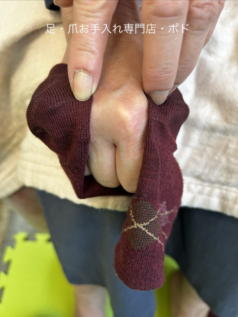 次に履く人の手の拳に靴下の踵とつま先を持って合わせてみると。。。。